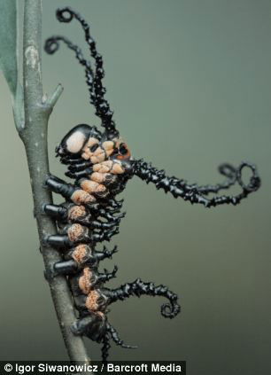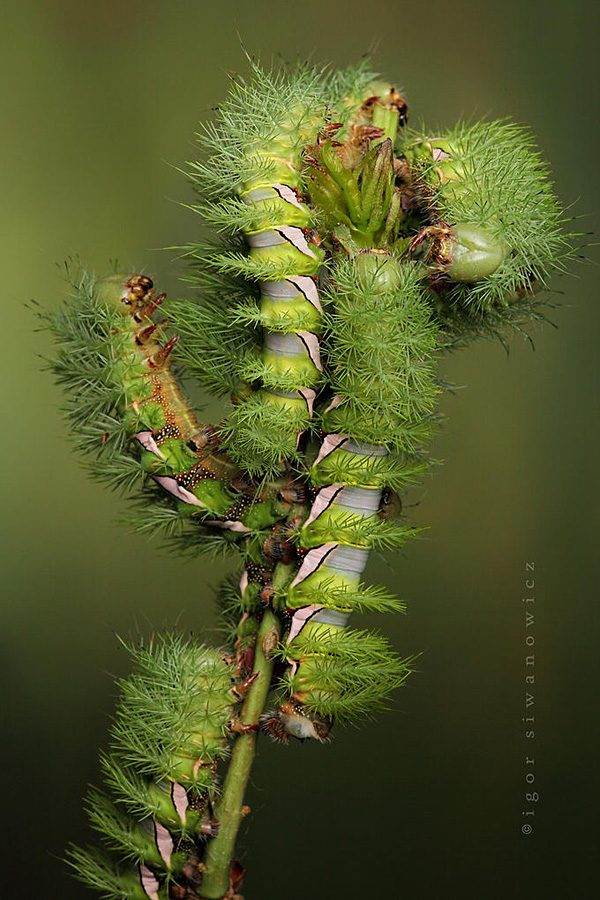 这是只将要变成婆罗门蛾子的毛毛虫宝宝。从照片中看,它就像小孩子的塑料玩具,又有些像恐怖片中的“反面人物”。它好像正在练习爬树,而没有时间理会镜头。
