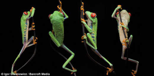 照片中的红眼睛树蛙正在攀爬葡萄藤。它的表情看起来十分严肃认真,看上去就像是接到任务正在赶去救援的警察一样。它皮肤的颜色十分鲜艳,颇像小孩子的塑料玩具。