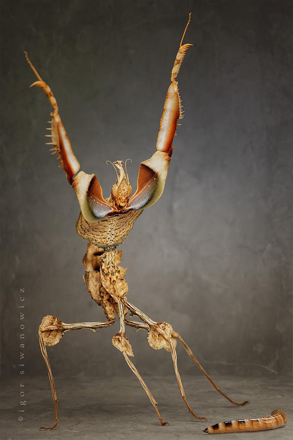 34岁的Igor表示他从童年开始就对昆虫非常着迷,他认为这些螳螂和其他昆虫非常动人性感而且充满个性,并且它们的离奇古怪和神秘感正是摄影创作中所需要的元素。他表示自己最喜欢的模特就是螳螂和其它的一些昆虫,另外一些爬虫类动物和两栖类的动物也很适合拍照。他在设计这些作品时主要的灵感来源是来自于一些电影中的怪物,此外他还希望在不久的将来能够出一本以螳螂为主题的书。