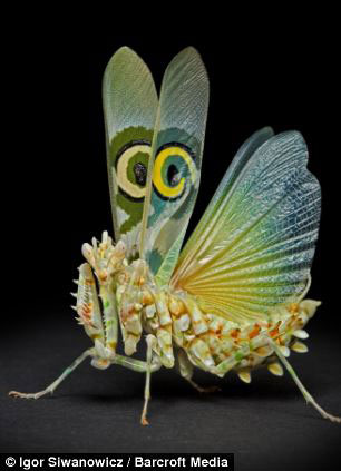 这是合掌螳螂中的一种,它能够在空中飞翔。从照片中可以看出,它的翅膀五颜六色十分美丽,当遇到敌人的时候,它就会展开翅膀吓跑敌人,从而来保护自己。