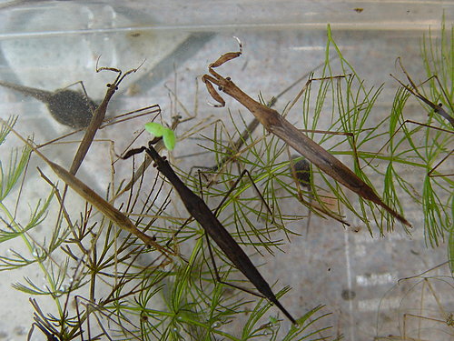 蝎蝽的外形有两种,身体扁平像鞋底的,通常生活在淤泥里,也是最常为小孩子捉来玩的“草鞋只”,一般把这种叫为水蝎子、红娘华、大红娘华。身体细长像螳螂的,通常生活在比较清净、又有丰茂水草的溪水里,一般把这种蝎蝽叫水螳螂,这种比较少见。