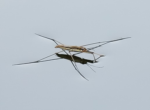 水黾的三对特别细长的脚,非常有力,也有着明确的分工,前脚进化成了捕捉脚,中足用来划分和跳跃,后足用来在水面滑行。它就是靠这些脚在水面上快速地移动的,所以它又有“池塘里的溜冰者”的美誉。