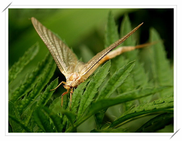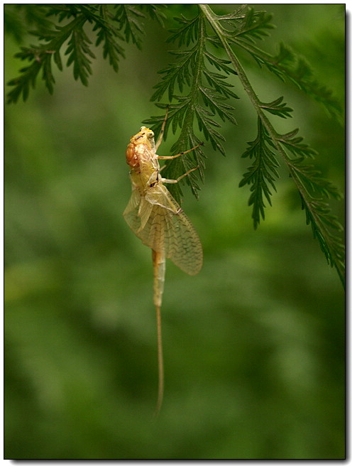 古人说:“蜉,水虫也,朝生暮死”,古诗里也歌唱说:“蜉蝣之羽,衣裳楚楚……蜉蝣之翼,采采衣服,心之忧矣,于我归息”,把蜉蝣的羽翼同妇女衣裙联系起来了,像轻云舒卷,如嫩柳拂水。