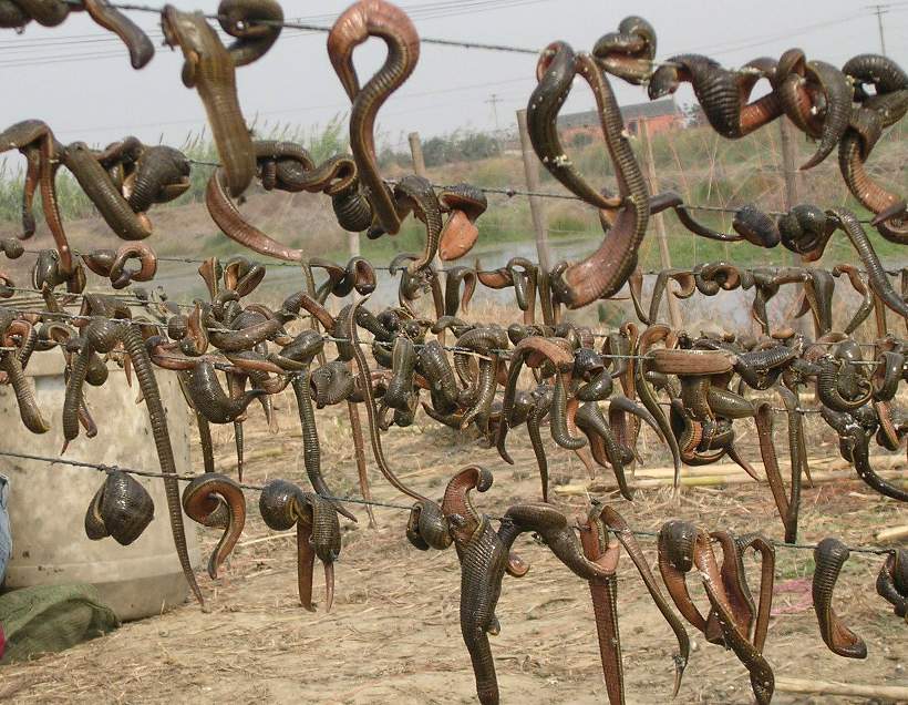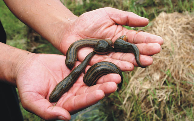 于普通人而言,水蛭是恐怖得不得了,而于医学上,却是个宝贝。活的,可以利用它的吸血的能力,把水蛭放到伤口处吸食毒血、腐肉,甚至是“输血”,在没有针筒和输血技术的古代,活水蛭就经常派这样的用场,很多武侠小说里也有关于水蛭吸血、输血的描写。死的,不管是把鲜活的水蛭捣成肉泥,或者整条活水蛭浸泡成药液,还是把原条水蛭烘晒成水蛭干,都是一味常用中药,功能破血、逐瘀、通经,治蓄血、妇女闭经、跌打损伤、眼目赤痛等等。
