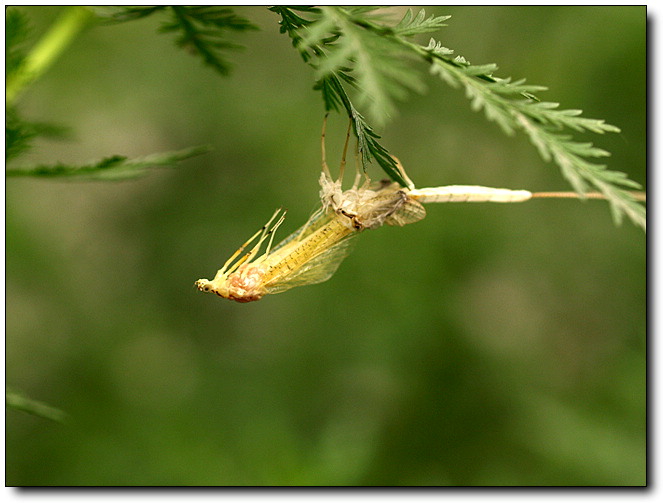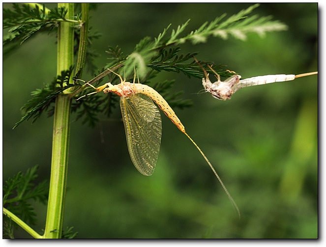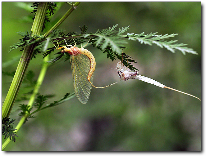 亚成虫出水后停留在水域附近的植物上,再经24小时左右蜕皮为成虫。成虫寿命短,一般只活几小时。然而在这几小时内,要经过两次蜕壳,练习飞行,恋爱,寻找配偶,交尾产卵,非常忙碌。完成后就疲倦的停下来死亡。在水里花费了两三年的准备工作,一生的大部分时间生活在水中,换来的就是成虫时飞翔的几小时生命,忙忙碌碌,完全不饮不食,生命过程虽短,却十分充实。