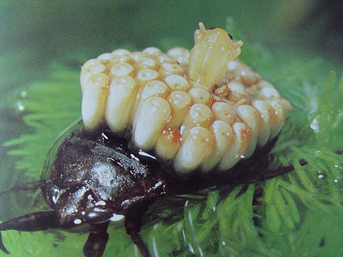 要是碰到两只负子虫层叠在一块在水里上上下下的游动,那也不是两只负子虫在打架、想要吃掉另一方了。说起来倒是温馨得紧,因为这是负子虫夫妻两口子在水里散步呢!负子虫的夫妻经常形影不离,生儿育女的分工也明确,合作无间,没有生孩子的平常时,雌虫便抱住雄虫,雄虫背负着雌虫,在水中悠闲地漂游散步,而捕食的任务也由雄虫担任。