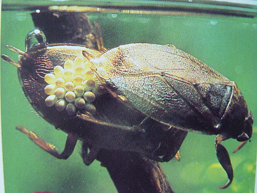 背上有虫卵的负子虫可是雄虫。大多数的动物都是由雌性负责照顾幼儿或者孵卵的责任,负子虫却是为数不多的由雄性负责的一种动物。因为雄性负子虫比雌虫凶猛,为了下一代的安全,雌虫便把卵产在雄虫的背上,由雄虫来保护;也是因为雌虫产完卵后,身体虚弱无力,说不定来不及抚养子女生命就会结束,要是把卵产在别处,容易被其它捕食动物吃掉,所以把卵产在“老公”的背上,那就可以放心很多啦!