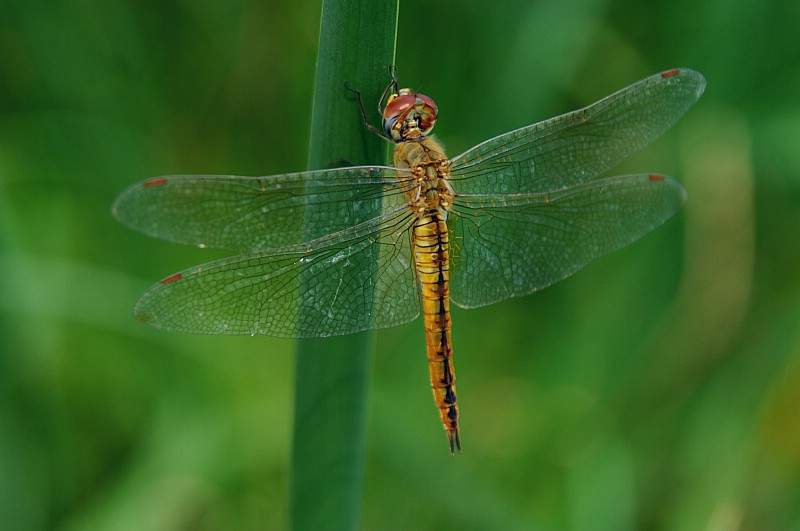 蜻蜓长着透明的膜质的又长又大的两对翅膀,但不能折叠收起来,即使在休息静止的时候,翅膀也是往外伸着的,身体又瘦又长,所以模样倒是有些像小飞机呢。它的飞行能力很强,不仅速度快,还可以在飞行当中突然回专,又可以以直入云霄,还能后退飞行。蜻蜓的眼睛大大的,几乎整个头部看上去都是它的这双鼓鼓的大眼睛,但其实那可不是一双眼睛,因为这双眼睛可是由两三万只小眼组成的,它是世界上眼睛最多的动物。蜻蜓是肉食性动物,它的脚上长着许多钩刺,可以在空中飞行时捕捉虫子,但它捕食的多是蚊、蝇、蝶、蛾等等害虫,所以对人们来说蜻蜓是益虫。