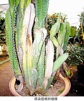 茎腐病此病亦称镰刀菌萎蔫病,很多品种均可侵染,幼小的仙人掌和嫁接的植株对此病特别敏感。幼株的根颈受害后,腐烂向上扩展,造成软腐,变为黄灰色或棕色,病情严重时植株发生萎蔫而死亡。