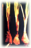 症状:茎、叶发病,球茎受侵染。根颈叶鞘部生红褐色小斑点,病斑扩大,叶鞘变黑褐色腐烂,维管束露出。茎上也发生同样腐烂斑,湿度大时变软。病株凋萎倒伏枯死。球茎上也生黑褐色圆形腐烂斑。