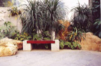 这种植物组合的核心就是充分利用差别做文章。丛生的丝兰拥有像剑一样狭长而直立的叶片,与四周栽种的质地柔软、植株较矮的柏木属植物、刺柏属植物形成鲜明对比。而丝兰旁边摆放的陶制大球,以粗糙淳朴的造型和灰蓝色的色调使整个组合更加突出,成为整个花园最为醒目的景观。