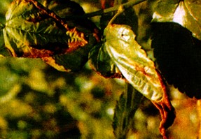 症状 受氟化物为害较重的桑树叶缘呈现褐色,污染严重的叶缘褐色向内扩展。
