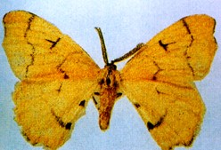 形态特征 成虫体长9.5mm,翅展35—40mm。体翅黄色。复眼球形,黑褐色。触角彬状,黄褐色。胸部、腹部背面具黄褐色毛丛。前翅顶角外突,下方向内凹,外横线、内横线为2条黑褐色波状纹,中室端具黑褐色短纵纹。雌娥腹部腹面具棕黑色毛。卵椭圆形,扁平,大小0.7×0.6(mm),非越冬卵块初乳白色,孵化前变为粉红色,卵块上无覆盖物,称之为无盖卵块。越冬卵块上盖有褐色毛,称有盖卵块。末龄幼虫体长24mm,头棕褐色,胸部乳白色,各体节多皱纹,皱纹间具黑斑,老熟后黑斑消失。腹部第8腹节背面具1棕黑色臀角。蛹乳白色,圆筒形,复眼、气门茶褐色。茧黄色,长椭圆形,丝层疏松。