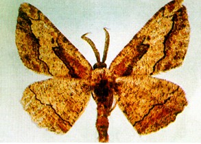 形态特征 成虫雌蛾体长10mm,翅展47mm,雄蛾体长16mm,翅展40mm。体、翅皆灰褐色。头小,灰白色。复眼圆形,黑色,触角羽状,短而阔,暗褐色;雌蛾触角狭长,双栉齿形,暗褐色。前翅灰色,外缘呈不规则齿状,缘毛灰褐色,翅面散有不规则的深褐色短横纹,中央具2条不规则的波形黑色横纹,两横纹间及其附近色泽较深。后翅近三角形,外缘波状,缘毛灰黑色,有1条黑横纹与外缘平行,线外比线内色深,翅面亦散生黑色短纹。腹部与翅色相同。卵长0.8mm,宽0.5mm,扁平椭圆形,浅绿色。末龄幼虫体长52mm,体圆筒形,从头至尾逐渐粗大。头扁平,灰褐色。初孵幼虫淡绿色,逐渐变褐色,与桑枝皮相似,是很好的保护色。各节后缘稍隆起,第l及第5腹节背面近后缘处各有一长形突起,背面散布黑色小点。气门9对,周围黑色,中央赤黄,第6—9腹节各生腹足一对。蛹长19mm,圆筒形,紫褐色,具光泽。