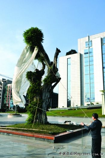 据现场搭棚的工人介绍,这棵榕树已有117年树龄,是2006年移栽过来的,老树最忌移栽,加之树下有积水,现在榕树的树干已经开始枯萎,只能靠树皮传送一点养分,所以必须给它搭建一个防冻棚,百年老树再也经不起霜冻了。