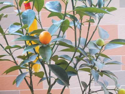 金橘在春节期间,以盆栽观赏为主,果实甜酸,皮肉可食。苗期每年翻盆换土1次,下垫鸡鸭羽毛做基肥。结果以后可每2年翻盆换土。金橘的隔年结果(大小年)现象不明显,如养护得法,可年年硕果挂满枝头。除水肥管理适度外,从春季萌发到挂果之前需适时适度进行三次修剪。第一次在早春果实采收后,应对所有枝梢进行重剪,每枝仅留侧芽2枚。50天后,约在4月上旬抽生新梢的叶片已经生长健壮,应及时进行第二次短剪,促发二次枝。至6月上旬再对二次枝适时摘心,促发三次枝扩大株冠,增加着果部位。这3次修剪的做法是广东花农促使金橘挂果迎春的传统经验。不同地区可根据自然气候和环境条件,调节金橘生长发育,总为适时开花坐果,达到春节观赏的目的。第三次摘心后长出的新梢,经40天至50天的生长,形成壮实枝条,叶片浑厚,叶色正常,表明金橘的主芽和预备芽都积累了孕育花芽的丰富营养物质。此时开始进行“扣水”,促发花芽。在8月中旬(处暑前10多天),逐日减少浇水量,使枝梢生长逐渐停止。到8月下旬(处暑前4 天至5天)停止浇水,经3天至4天日晒,叶片发蔫下垂,进而因缺水叶缘向内翻卷。盆土处于相对干旱状态时,可在早晚向叶片洒些水,中午稍向盆中点些水,以防止叶片萎蔫到不可逆转的程度。当植株的主芽及预备芽都已膨胀,从绿转白时,即为花芽分化完成。此时逐步恢复浇水量,并追薄肥,从8月末到9月初就陆续开花。