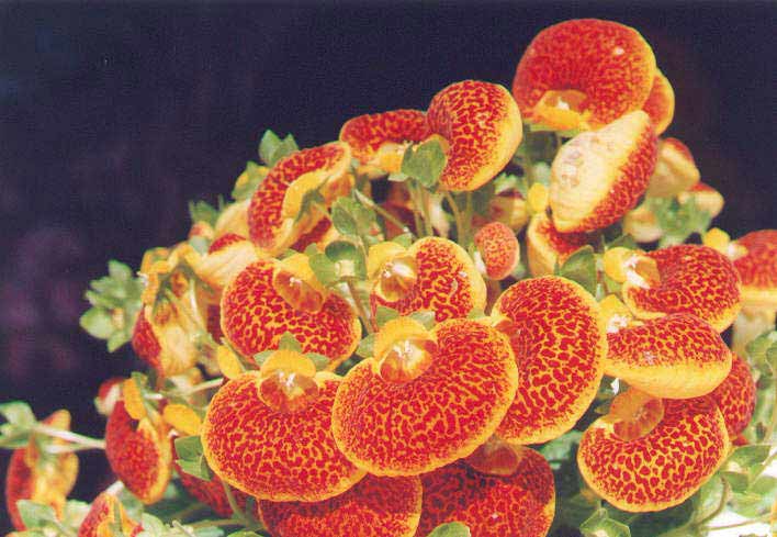 形态特征:1 年~2 年生草本。株高不到60厘米, 有分枝;叶对生或轮生,长椭圆形或卵形, 两面有绒毛。顶生不规则的伞形花序,花形奇异,萼片4,花瓣 2唇,上唇小,稍向前伸,下唇大,成为荷包状,花色艳丽多彩,有黄、红、紫等色及各种斑纹。是冬春季重要的温室盆花。