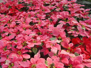 重瓣一品红:本种的雄蕊雌蕊均退化,总苞上着生多层红色苞片,叶较单瓣种的阔而短,观赏价值较高。