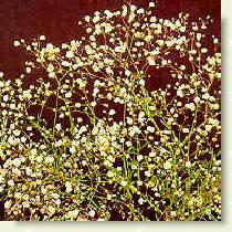 满天星又称锥花丝石竹,多年生草本;叶宽不到1.2厘米,1脉;花白色,花径0.25毫米,花朵多,每株可达千朵,圆锥状聚伞花序,有芳香。作为各种花束、花篮、插花的陪衬,具有独特的魅力。与玫瑰、康乃馨、菊花、非洲菊等相配,瓶插花美丽无比,倍受人们喜爱。