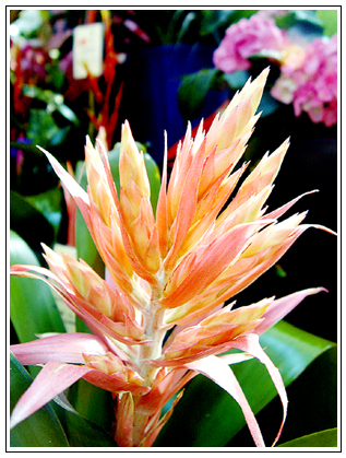 “丽人花”为凤梨科观赏植物。植株高40厘米左右,叶片厚实,花朵硕大,浅橙红色,花期长达5个月以上。适宜在20℃以上的环境中生长,喜高湿,在养护时要注意多浇水。能适应光照不良的环境,是室内摆放的盆栽佳品。