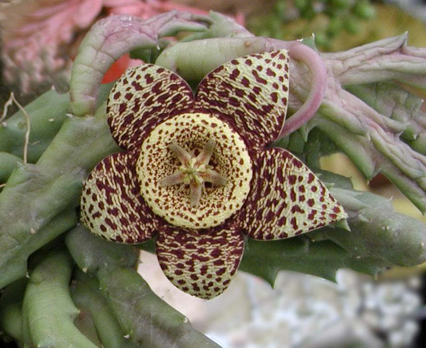 形态特征:多年生肉质草本植物。多茎丛生,高10厘米至20厘米。茎四棱柱形,顶部微曲,光滑无毛,棱脊上具粗短软刺,绿色,无叶。花期夏秋但不定时,花基生,单生或2朵至3朵并生,花径5厘米至6厘米。花瓣5枚组成五角星状,花瓣黄色,其上分布棕红色横纹或斑块。星状中心凸起一个外轮,轮内下部有5个隔,中部有5个圆点,顶部又有一个微型五角星,色泽与外瓣相近。整个花朵光彩夺目,别具一格,是观赏价值很高的盆栽花卉。由于它的花色与金钱豹的毛皮极为相似,故有“豹皮花”之名。由于花形呈五角星状,与军人帽徽相像,又名“微纹掌”。