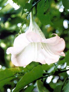 花单生,下垂,喇叭状,长约20厘米,花冠粉红色。花期7~9月。