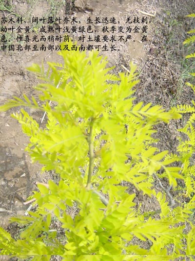 生长迅速,无枝刺,幼叶金黄,成熟叶浅黄绿色,至秋季变为金黄色,枝条舒展株形美丽,不结实。