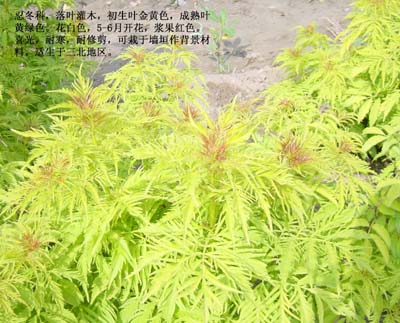 忍冬科接骨木属,落叶灌木,高2.5-3米,冠幅1.8-2.5米,初生叶金黄色,成熟叶黄绿色。