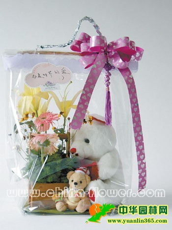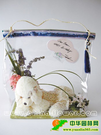 材料龙口花,太阳花,紫阳花,寿松,春兰叶束,玻璃纸,富贵狗,缎带及中国结饰品,塑胶盒,纸绳。 制作过程1.根据礼物的体积割出所需的纸板大小,再用棉纸美化。 2.玩具放于纸板上,并用双面胶固定,以免滑动。用轻便塑胶盒美化湿花泥,当作花器,配花以简洁清爽的为好。 3.以制作纸袋的方式,用大张透明玻璃纸做立体包装,并加以缎带收尾系上提手绳。