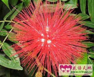 朱缨花是一种很漂亮而且有点特别的花。刚刚发出的芽看上去是有点弯曲的,而且还略带有点嫩紫红色。等花芽长成熟后就变为红色的花了,挂在那常绿大灌木或小乔木上,微风一吹,那些圆圆的红色毛绒绒的样子,就像一团红色的毛球,看上去十分的可爱,于是民间就叫它为“红绒球”,这个名字也实在是很形象的体现出来了。其实,只要你走近去看,这一团“红色的绒球”实际上是包含了好几十朵的小花呢,花还没开放的时候,花苞的颜色是淡紫红色的,当完全开放的时候,则会吐出一簇簇漂亮的花蕊来,那漂亮的花朵就像丝一样的细小,当这些花凋谢的时候,这些“红色的毛绒”就会先渐渐萎蔫,然后它的旁边又会慢慢的长出一条扁长的荚果来。是否觉得很漂亮很独特啊?
