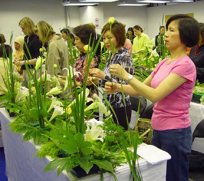 自5月5日开始,花展特设了插花沙龙,观众可在名师指导下亲自参与制作插花。而今天下午的插花沙龙有点特别,因为参加的不是普通上海老百姓,而是各国驻沪领馆或领事夫人。在专设的插花沙龙教室里,二十多位各种肤色、不同国籍的“夫人们”济济一堂,在市插花花艺协会会长蔡仲娟的指导下,专心致志地摆弄着面前的花花草草。有的领事夫人甚至把孩子也带来了,一起学习插花,以此来陶冶情操,提高审美情趣。