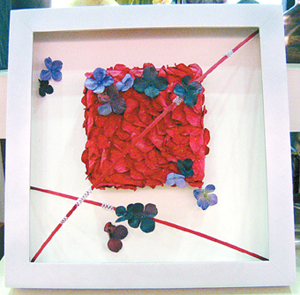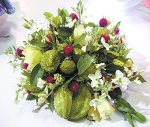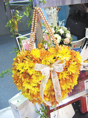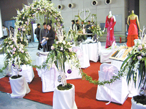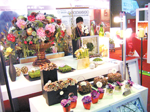 爱珂花卉这次与一家婚庆公司合作,在现场制作了各类婚庆用花,包括花拱门、路引花及新娘捧花、颈花、腕花等。这些花艺作品的材料是以浪漫娇羞的各色玫瑰为主,另有百合、泰国兰、、非洲菊等,再辅以形状不同的各类叶材,把整个展位打扮得花团锦簇。据爱珂的花艺师介绍,此次博览会由于临近圣诞,他们还特意在作品中添加了彩色小球等圣诞元素,使其更贴近12月婚庆用花的氛围。 而百昇现代装置公司带来的用干花和仿真花制作的家居饰品,更是让观众驻足流连。这家公司的产品主要由台湾设计师进行设计,再由公司人员手工制作完成。这些仿真花饰品以精巧取胜,它们大多体积不大,分为餐厅摆件、客厅作品、卧室装饰、浴室小品等系列,价位一般在几十元到百元左右。许多观众面对这些五彩缤纷、个性十足的花艺饰品爱不释手,有的还想当场买一个样品带回去。也许过不了多久,这些具备时尚特色的花艺饰品就会进入更多的家庭,像窗帘、灯具等生活需要品一样,出现在高级百货商场的货柜中。