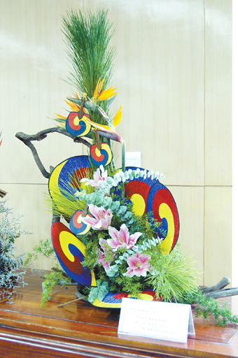 韩国庭院花卉艺术中央会梁贞子会长的作品。作品的主题是“爱心”,上面鹤望兰为中心的代表中国人的爱心,下面红色的圆环代表韩国人爱心,中间红色的百合代表中韩两国爱心的融合。这完全是一个韩国风格的花艺作品。