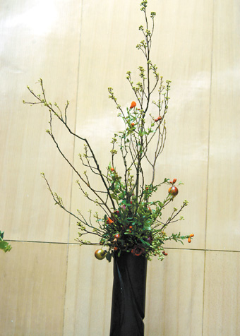 韩国SOL-BIT花卉艺术中央会李京淑会长的作品。该作品以果实为主材,体现秋季主题。果实很小,线条很多,体现了东方插花在韩国的演变。