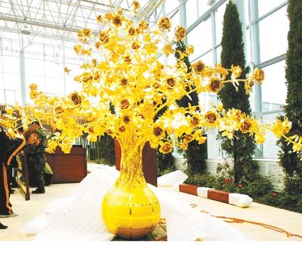 在现场负责指挥大家抬金玫瑰入园的某旅游商品开发中心的相关负责人刘红灿告诉记者,这棵金玫瑰是该公司使用传统的雕刻工艺和贴金工艺制作成的,特殊赠送给沈阳世园会。