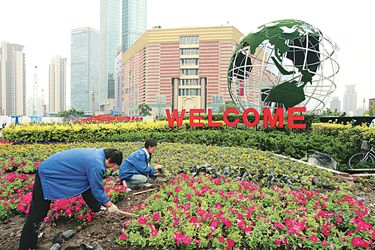 昨天市绿化管理局局长马云安透露,全市绿地整治将近13.8万平方米,花卉布置近300万盆,行道树整治8000多棵。浦东新区共设计了17个花卉景观,十分抢眼:上海科技馆附近的砂岩广场,主题花卉既似白鸽飞翔又如两手交握,象征了和平与合作;东方明珠电视塔前的环岛,白鸽环绕着镂空地球仪,象征着世界和平。卢湾区的重点花卉景观在淮海路沿线的各大路口,使整条商业街花团锦簇、生机盎然。与浦东着重立体花卉不同,长宁区的11处花卉景观以平面设计为主,延安路伊犁路口的三角绿地、仙霞网球场前绿地等都已盛装待客。黄浦区组织专门力量设计了游船码头的景点方案,20000余盆6种不同颜色的鲜花和南方植物制作了象征“六国和谐”的两组130平方米的花坛。