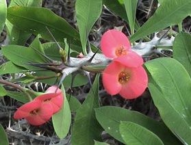 虎刺梅株高50—100厘米,灰绿色的干枝带刺,校上疏生鲜绿色匙形或倒卵圆形叶片,枝端开出鲜红、玫红的小花。花期长,花色鲜艳,形姿雅致,栽培容易,是人们喜爱的好花。