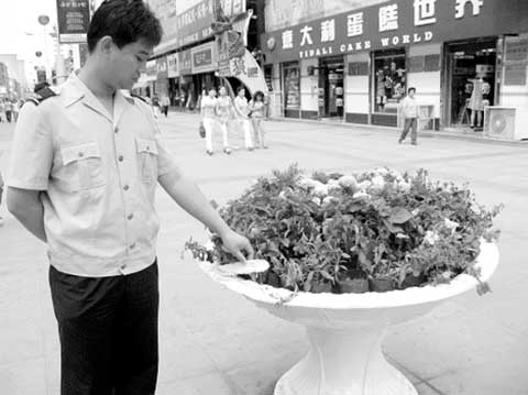 为了伴靓我市商业步行街,给市民创造一个舒适、靓丽的购物环境,新抚区城市管理综合行政执法局投资万余元,在东西四路步行街上摆设了14个直径1米多的花盆;然而近一个时期,花盆不断被人为推倒,致使花盆和鲜花损坏。