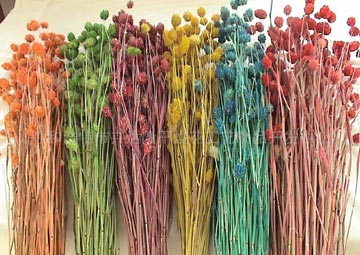 一般在花市所看到的干燥花,是属于专业加工制品,采用急速干燥的方式,使花卉保持很好的颜色及姿态,有些还会加上染料或发色剂,使花朵颜色更为鲜艳多彩;另外也有应用木皮削薄片制作成花朵的外形,再加上硬化处理过的枝干,这种需要较多手工的加工干燥花大多由东南亚制作进口。也有一些干燥花是由欧洲、美国、日本、南非等国家进口,大多是自然风干的花卉,颜色虽不鲜艳却有另一番古朴的乡村风,而且不同国家的花卉,种类也不同,因此可以找到很特别的样式,有些还可应用果实,种子等部位制成干燥花,例如松果、莲蓬、麦穗、山防风等。