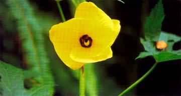 科属 锦葵科秋葵属形态特征 一年生或多年生草本。高且1-2m。叶5-9掌状深裂。单花腋生,黄色,内面基部紫色,直径达12cm。花期7-10月。 喜温暖,喜肥。产西藏墨脱、吉隆,多生于海拔800-1800m的山坡灌丛、林缘。中国广布,印度也有。