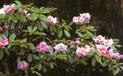 喉斑杜鹃 学名 R.fuacium 科属 杜鹃花科杜鹃属形态特征 常绿灌木或小乔木。高1.5-6.5m。叶片倒披针形。花序具5-10朵花;花冠钟形,粉红色,长约4cm,喉部具紫色斑点。花期4-6月。喜凉润。西藏特有植物。产西藏东南部,常生于海拔2600-3800m的林缘。