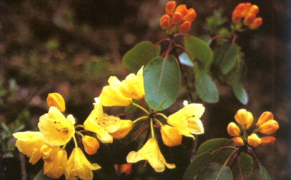 学名 R.wardii 科属 杜鹃花科杜鹃属形态特征 常绿灌木。高1.5-4m,或更高。叶片卵形、圆形、长圆形,背面具小腺点。花伞形或总状伞形,有花5-14朵;花管宽杯状或碗状,黄色。花期6-7月。 喜冷湿,喜光。中国特有植物。产西藏东南部,生于海拔3700-4500m的冷杉林下或高山灌丛中。四川和云南西北部也产。本种在光照条件下。花蕾红色;蕾花并存,格外夺目。