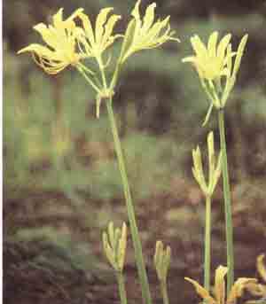 忽地笑 (黄花石蒜、铁色箭) ,石蒜科石蒜属多年生草本植物。鳞茎肥大,近球形,直径约5厘米。叶基生,质厚,宽条形,长达60厘米宽约1.5厘米。花葶高30~60厘米,伞形花序具5~10朵花。花黄色或橙色。蒴果每室有种子数枚。