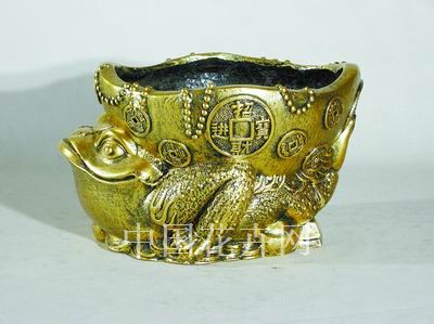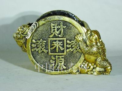 金蟾送宝,财源滚滚。相貌憨态可掬的大金蟾驮着装满财富的元宝送进你家,让你一生富有。