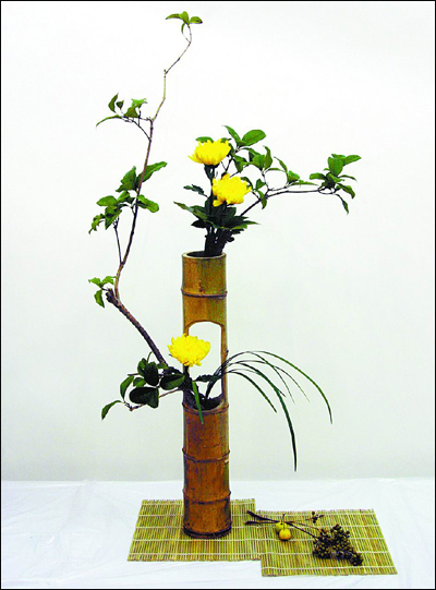 点评:《风叶青葱亦日香》采用的是双层竹筒插花。竹朴实自然,没有一丝奢华,更没有矫揉造作。花分上下两层彼此呼应,如飞天舞袖,游龙戏凤,婀娜多姿。花材只用了桂枝、黄菊、麦冬三种,却能表现得淋漓尽致。所用色彩简约清新,三支菊花起到画龙点睛作用,真可谓“室雅何须大,花香不在多”。
