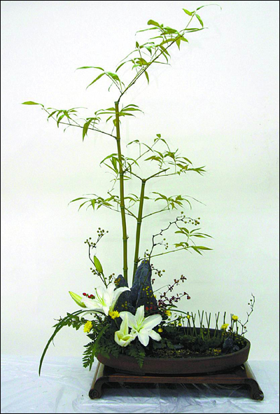 点评:《秋尽江南草未凋》是一件较为典型的传统插花造型。有花、有盘、有几座,三者合而为一,民俗气息甚浓。作者采用了竹、百合、冬麦、山归来、小檗、小菊和高山羊齿等,品种不少,用量不大,特别是两根竹子,一高一低,有着“只须三两竿,清风自然足”的诗情画意。两峰山石和篱墙等构筑了小桥流水人家的江南田园风光。作品小中见大,趣味盎然。
