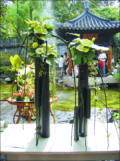 点评:《习风送夏爽》采用两只圆盘状草编作为插花创作的主体背景,作者加了手柄就成了两把团扇,并在两只铁架的支撑下形成错落与层次的变化。作者一开始就点明主题,让人直接顺着意境去体会内含所在。花材有针垫花、月季、苋、变叶木、文心兰、刚草、麦冬等,使用的种类虽多,却能彼此呼应,对空间处理亦能恰到好处。作品采用了现代花艺陈设方式,又能结合传统插花的聚合与离散及线条变化等手段,两者顺理成章,自然入扣,而且动感明显。