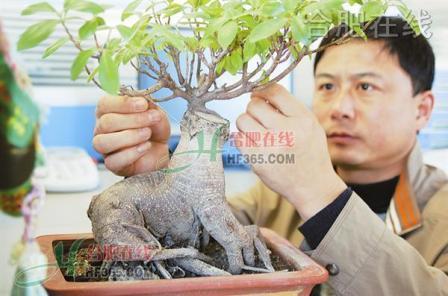 在阜南县市民代先生的一棵榕树盆景造型越长越像小鹿:上面长出的树枝像鹿茸,扎在泥土里的树根像鹿脚和可爱的小尾巴,树身更像丰满的鹿身,虽然树身上体现不出“鹿”的“梅花”花斑,但从远处看还是特别像一个卧在那里“憨态可掬”的“小鹿”,造型十分逼真,令观者惊叹不已。