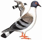 描述:体大(35厘米)的鸽。羽色似红嘴鸥;头深灰;领、下背及下体白色;上背褐灰,腰黑色;尾黑,中间部位具白色宽带;翼灰,具两道黑色横纹。