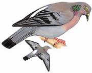 描述:体小(26厘米)的灰色鸽。背白色,翼上具两道不完整黑色横纹,颈侧有具绿紫色闪光的小块斑。甚似欧鸽,但背部白色;初级飞羽基部的浅色区域大些;头顶粉红,翼下较白,眼色浅而眼圈宽。